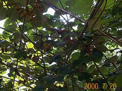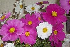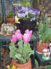 | 全体が写っていないのが残念ですが、 手前はストロベリーポットです。毎年 上にチューリップ、横にビオラを 植えます。うしろの緑のいすは COCOが色を塗りました。 |