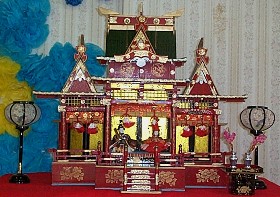 これは、ちびでびるの幼稚園のお誕生会の時、同時に雛祭りもってことで お遊戯室に飾られたお雛様です。七段飾りと五段飾りの2つのお雛様があって こちらは五段飾りの一番上の段です。お社の中にお内裏様とお雛様のいる ちょっと珍しいお雛様です♪こちらは2002年3/1撮影。