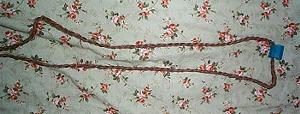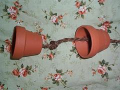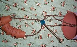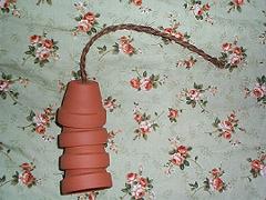 足用の紐をホースに通し、胴用の鉢の下から穴に通し引き上げます。 |