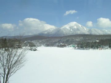 向こうに蓼科山、手前は白樺湖が凍って雪が積もっています。 白樺湖が凍ってるいるのは初めて見ました! |